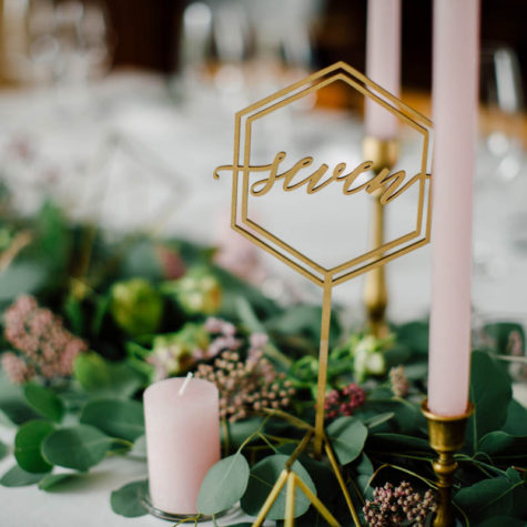 Une belle alliance entre la couleur vert-de-gris du feuillage et rose poudré des fleurs et bougies, réhaussée par le gold des éléments décoratifs.